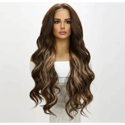 13*6 Lace Front Wig Honey Brown Balayage Long Layers Human Hair Blend Ombre Waves